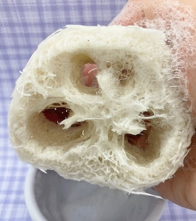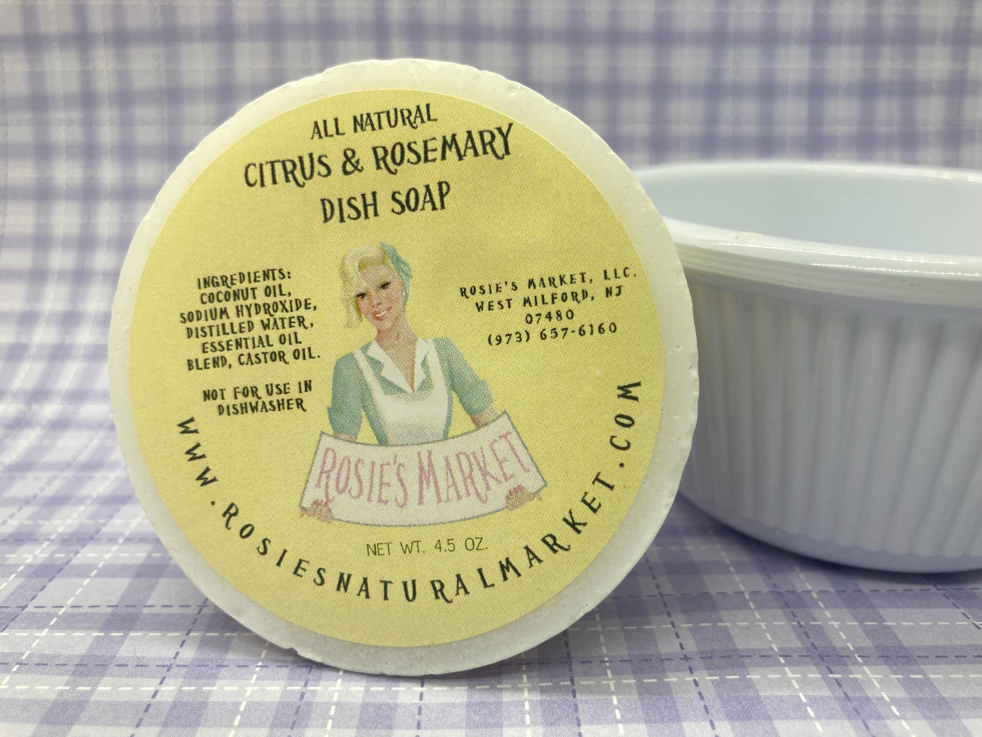 This soap set comes with a 4.5 oz bar of dish soap in a ramekin, a scrub brush, and a 1" loofah sponge.